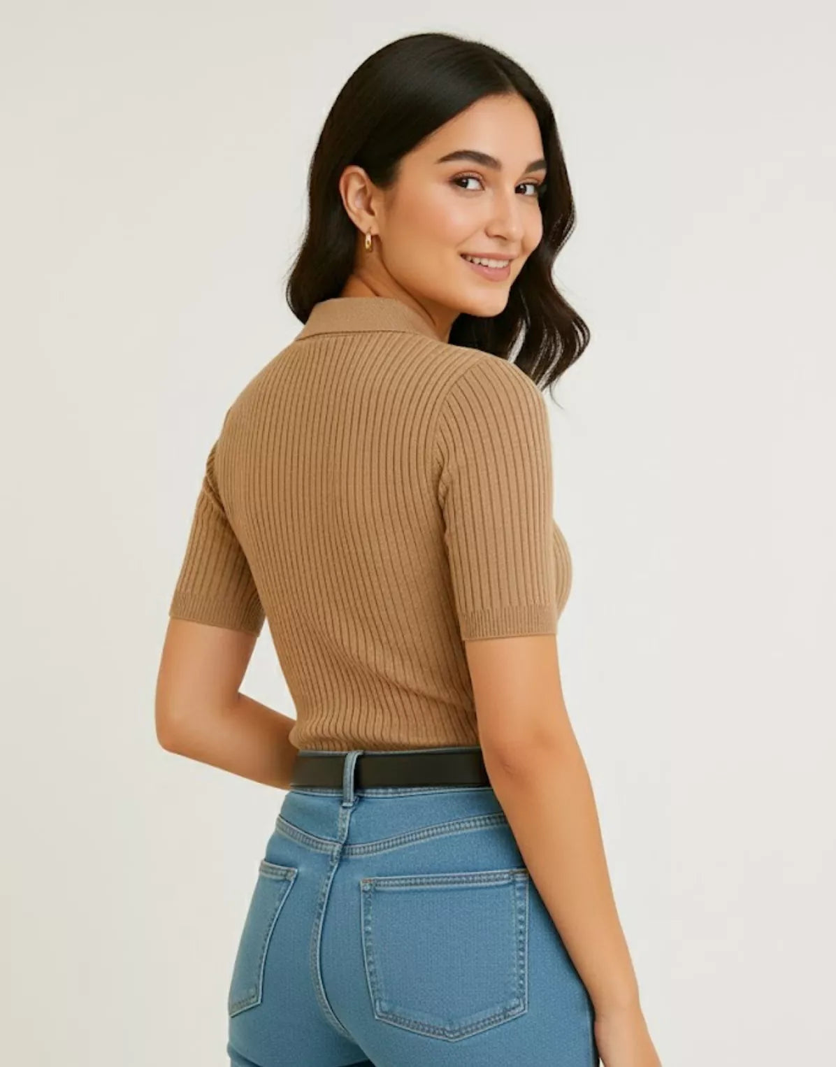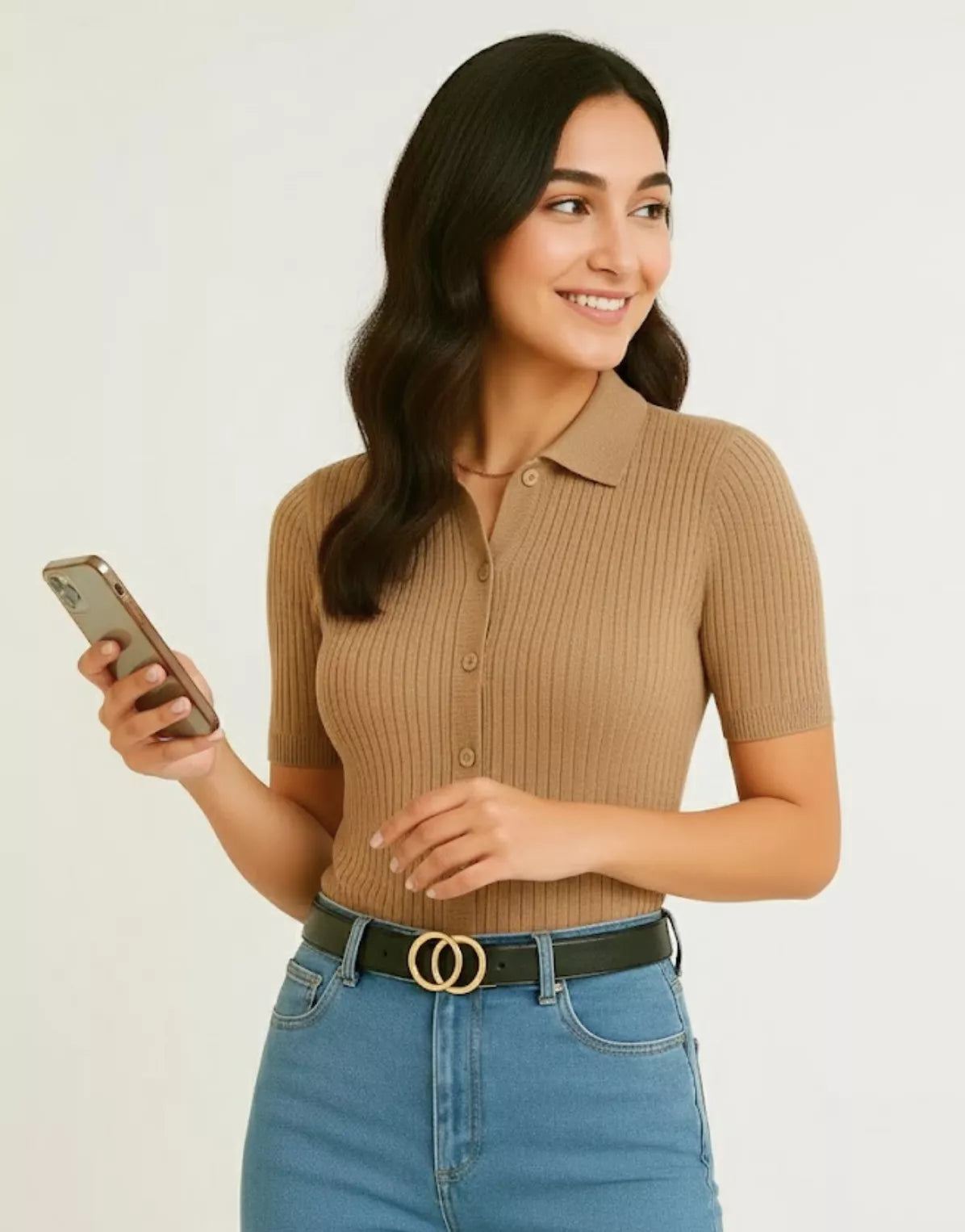 Introducing the SGW Beige Front Full Button Rib Knit Tee - Half Sleeves, a perfect blend of comfort and style for your summer wardrobe. This ribbed knit polo features a classic collar neck and short sleeves, offering a timeless look that's both versatile and chic. Crafted from high-quality knitwear, it ensures a comfortable fit and breathability, ideal for warm weather. The solid beige color adds a touch of sophistication, making it easy to pair with any outfit. Whether dressing up for a casual day out or keeping it relaxed at home, the SGW Rib Knit Tee is your go-to choice for effortless summer style.