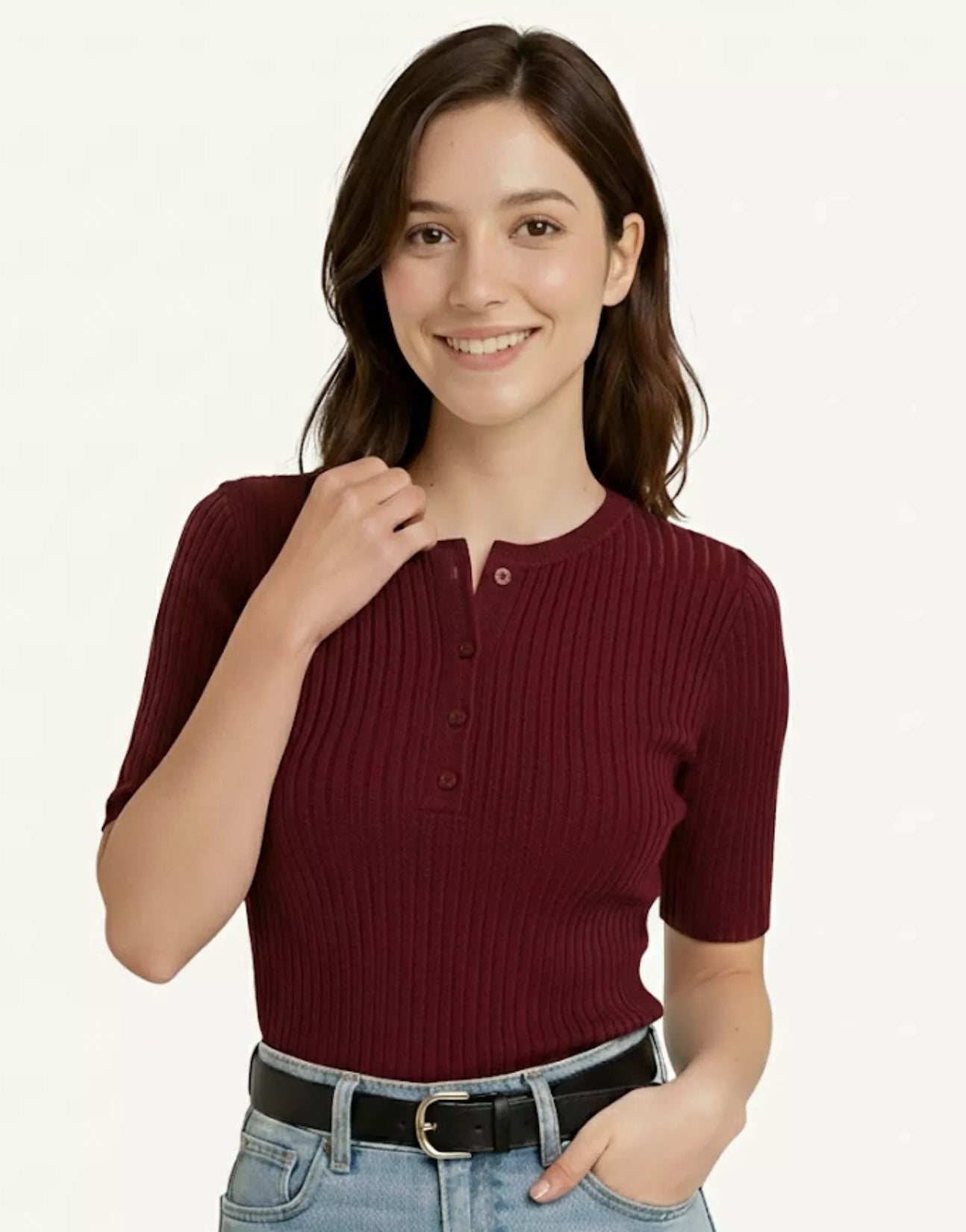 SGW Maroon Round Neck Button-Front Top - Half Sleeves – SelectGraceWear
