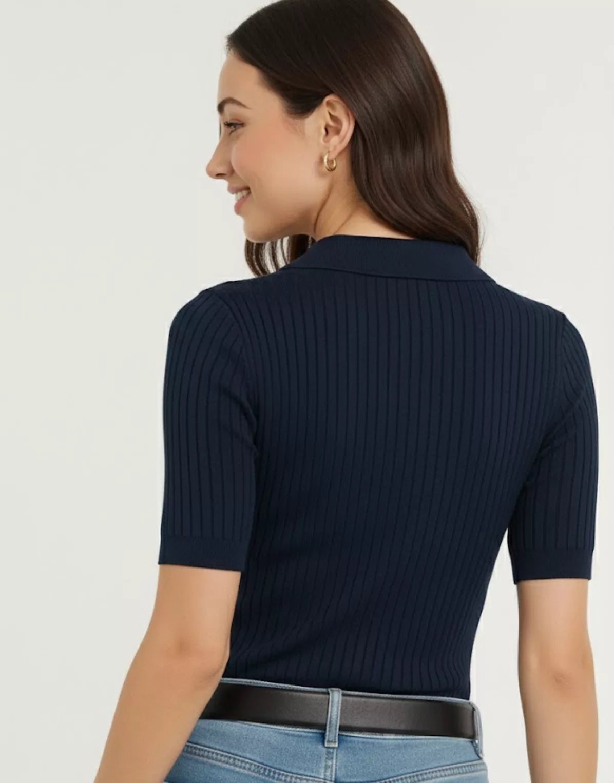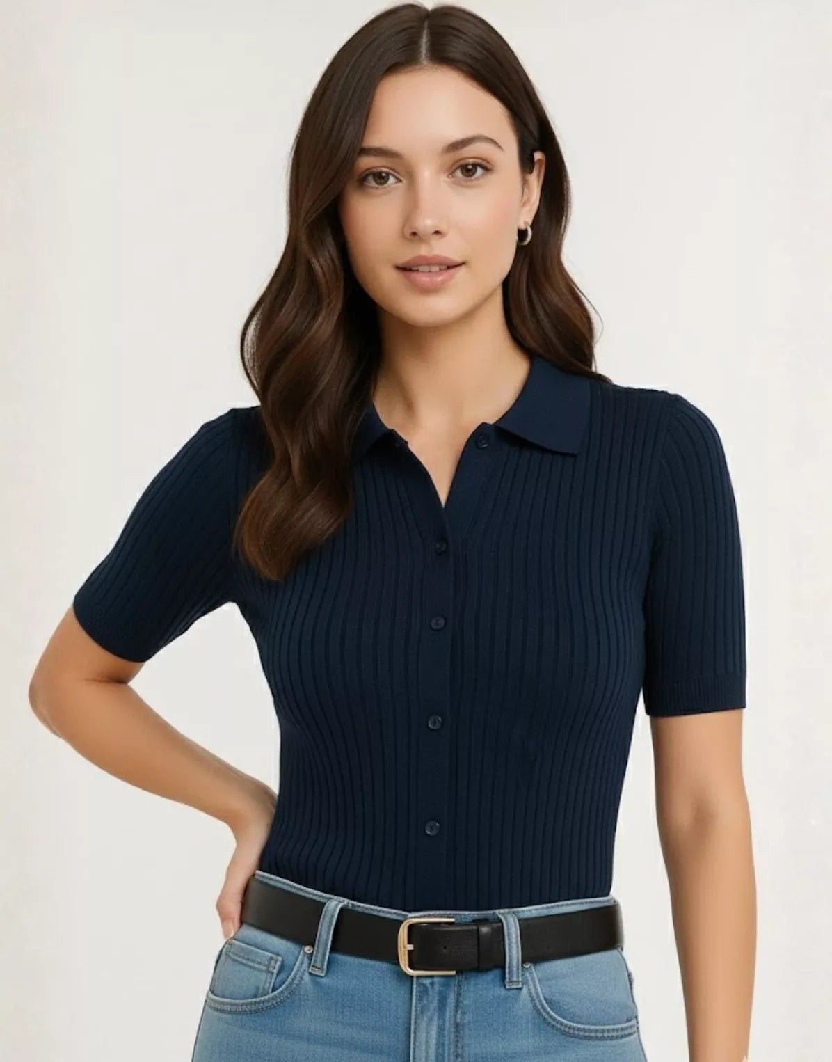 SGW Navy Blue Front Full Button Rib Knit Tee - Half Sleeves – SelectGraceWear